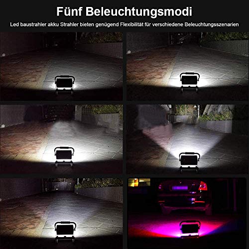 【Superhelle, weiße Lichtmodi und SOS-Modi】Led Baustrahler Akku bietet 6 Helligkeitsstufen: Abblendlicht / mittel / stark hell, Fernlicht, Abblendlicht und Fernlicht, Stroboskop (rot blau) Helligkeitsmodus. Rot/Blaues Notfall-Blinklicht – praktisch für Pannenhilfe oder andere Notfälle.